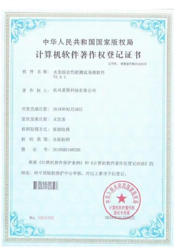 水泵綜合性能測試軟件證書