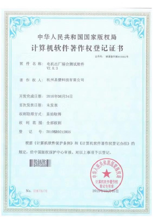 電機出廠綜合測試軟件證書