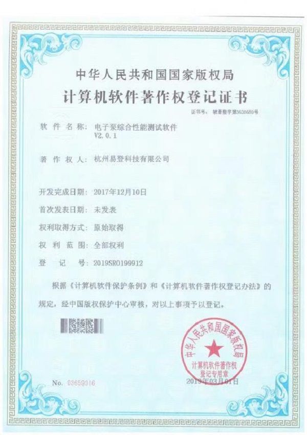 電子泵綜合性能測試軟件證書
